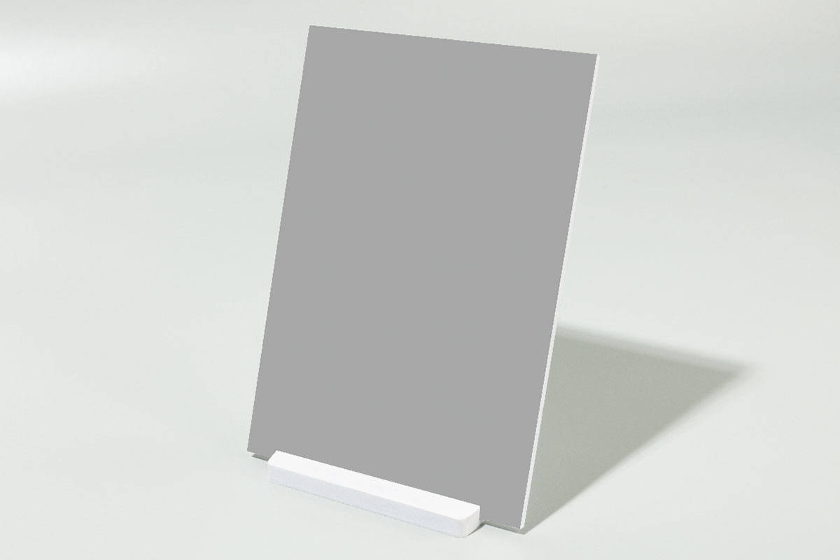 Soporte de pvc blanco de 10mm. de 15x10cm. y con ranura de 1mm. o de 3mm. Ideal para emplear como base para cartelería de sobremesa.
