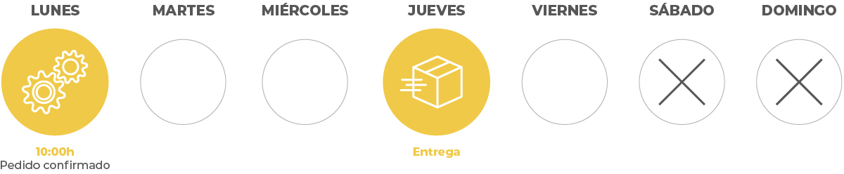 Actualmente ofrecemos un servicio de entrega de 72 horas en la Península Española para todos nuestros productos, desde el momento en que se genera la notificación de que el pedido está en curso. Así pues, si quieres que tu pedido llegue en 3 días hábiles, debes hacer el pedido antes de las 10:00h. de la mañana.